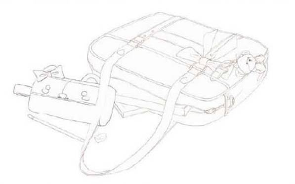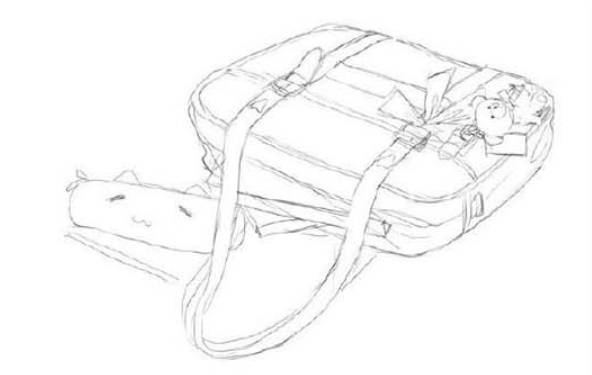 我们先来确定一个草稿,单独画一个书包稍微有一点单调。这里增加了一些文具书本,以及小的挂饰,草稿可以不用太细,就把大概的位置以及想法确定下来就可以了。