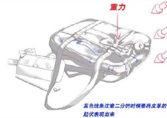 首先在决定画一个物件的时候,要先去找一下参考图,多去观察这个物体有什么特点,可以去搜索一些素材作为参考。例如上图我们观察出书包是一个长方体,并且四个角都是比较圆润的,边缘比较硬挺中间的皮质稍软一点,东西放少了会塌下去,皮质也是比较有光泽,但是高光不是特别强,根据观察到的型,我们继续往下进行。