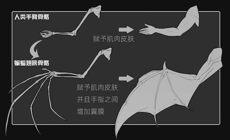首先是翅膀的结构。大家要知道我们所熟知的恶魔翅膀也好、西方恶龙翅膀也好,其实原型都是现实中的蝙蝠翅膀。所以不管是在结构还是造型上蝙蝠翅膀都是一个非常重要的参考依据。也因为如此所以画这类翅膀时不要凭空想象,以蝙蝠翅膀这个初始造型作为依据进行设计和绘制,会让你的画面更有说服力和合理性。
