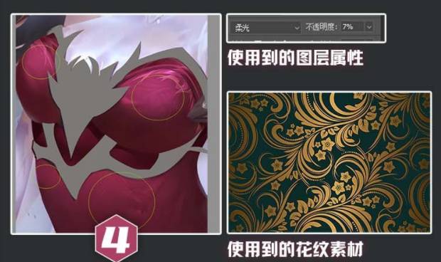 现在常规布料的质感已经出来,一般这种程度可以叠加花纹材质了。花纹层放到画好的布料层之上。图层属性可以根据效果切换,这里用的是柔光。