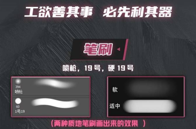 特点:软(喷枪)+软硬适中(1号19号)这两种质地的笔刷搭配,很适合画布料这种比较柔软的材质。