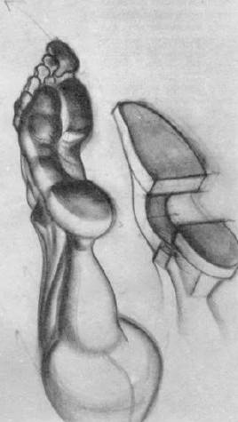那么由此我们可以总结一下整个脚的组成部分以及形状:像扳手一样的脚踝卡在拱桥形的脚背上,下接舞台阶梯一样的四趾和大拇趾。后坐脚跟上。