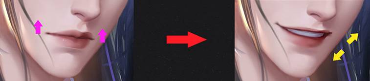 然后注意嘴巴的部分,直接选区嘴巴往上移动,然后手动加上牙齿的部分,注意把上唇画的薄一些,因为已经笑开了,上唇是被扯平的,不会太厚,然后两边嘴角都要上扬,下唇的孤度要再圆润一些,记得画出两个嘴角的一个闭塞区域,然后尤甚淫意,不要画牙齿!嘴巴里面牙齿的颜色也不要太亮了,不然容易显得像龅牙。笑起来颧骨会提起,靠近下巴的脸颊轮廓则要任内收一点。