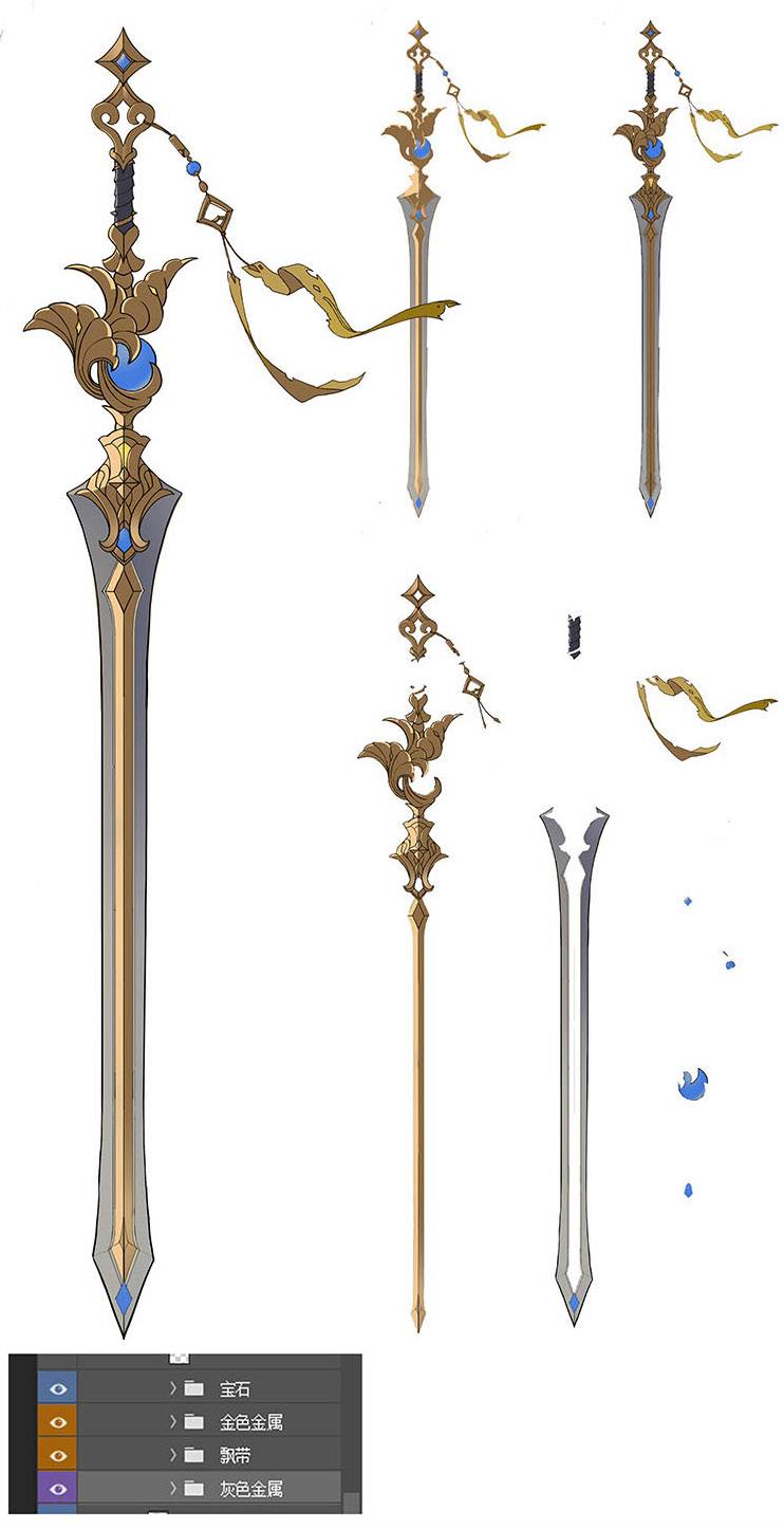 可以调整一下金属的颜色。这里需要注意区分一下金属的剑身和剑柄,可以做一个金色和一个银色。因为是银杏叶的主题,还可以加一些黄色进去,丰富一些配色,最后再加一些蓝色宝石作为点缀色,到了第四步的时候我们可以整理一下图层。