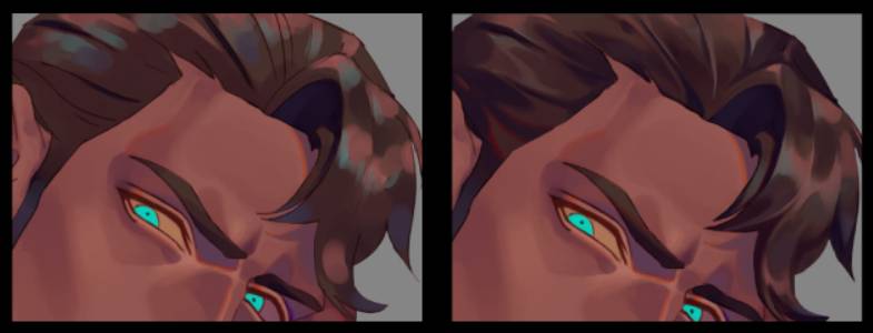 与肤色步骤基本相同。在这个阶段添画的高光比较杂乱,之后再进行调整。