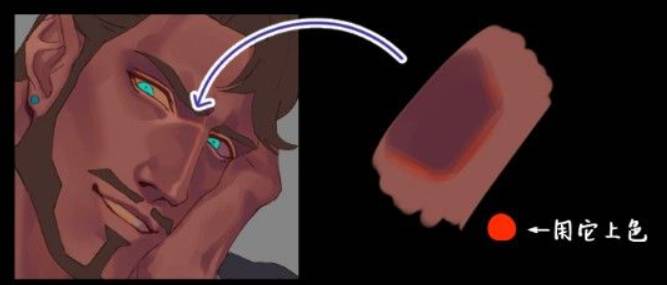 2.1、根据铺色时的基底颜色,选用较深的颜色(参照色轮),粗略地绘制出阴影。使用亮色,根据喜好在合适的位置添画高光。我在眉头的褶痕处添加了高光。