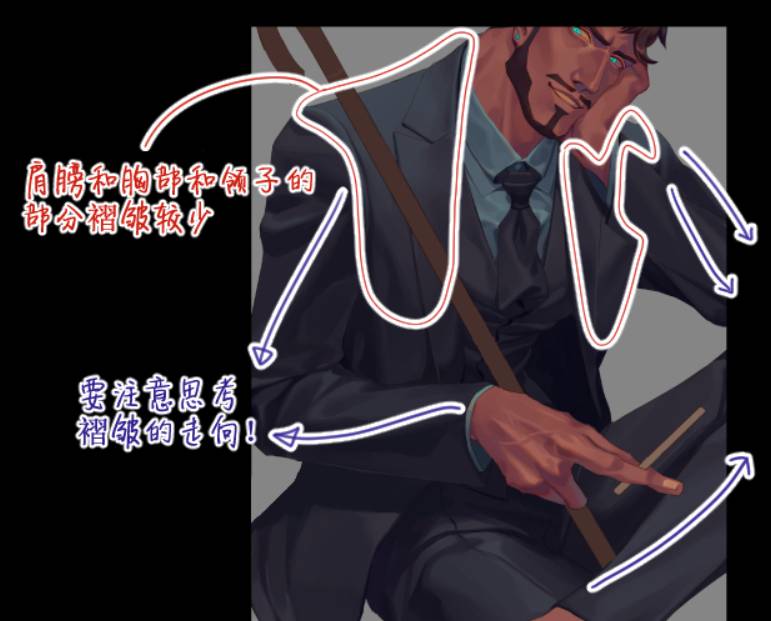 领带后方的凹陷处的缝隙阴影也画出来的话感觉很愉悦。(个人喜好)