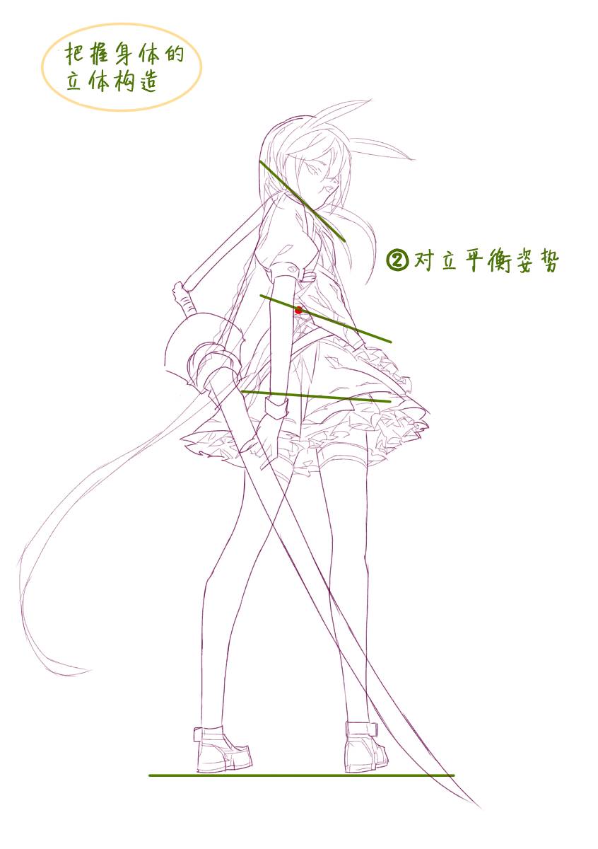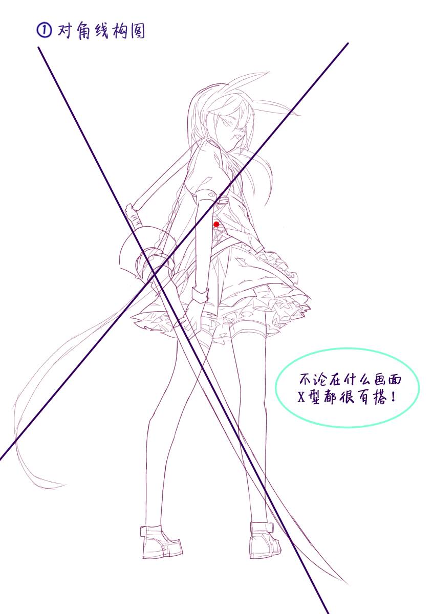 第二步、为了避免出现立绘中常出现的很平淡的画面。可以借助头发、道具等来构建对角线。这时,对角线的交点要放置在和重心稍有错开的位置较为合适。
