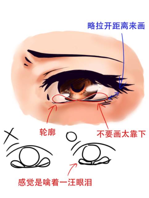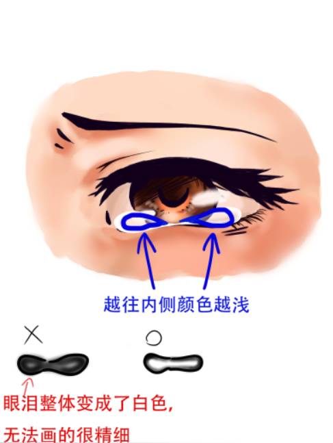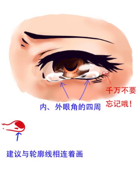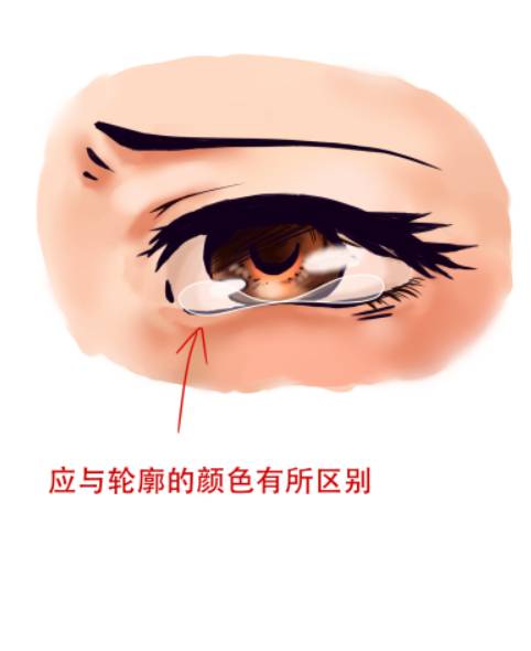 4、光。噙在眼角的眼泪,要为其画出光泽。建议画出稍有变形的圆形的感觉。没有眼泪的大眼角的位置要涂上浅浅的白色,画出小小的圆形。需要使用的画画工具是钢笔、G笔。