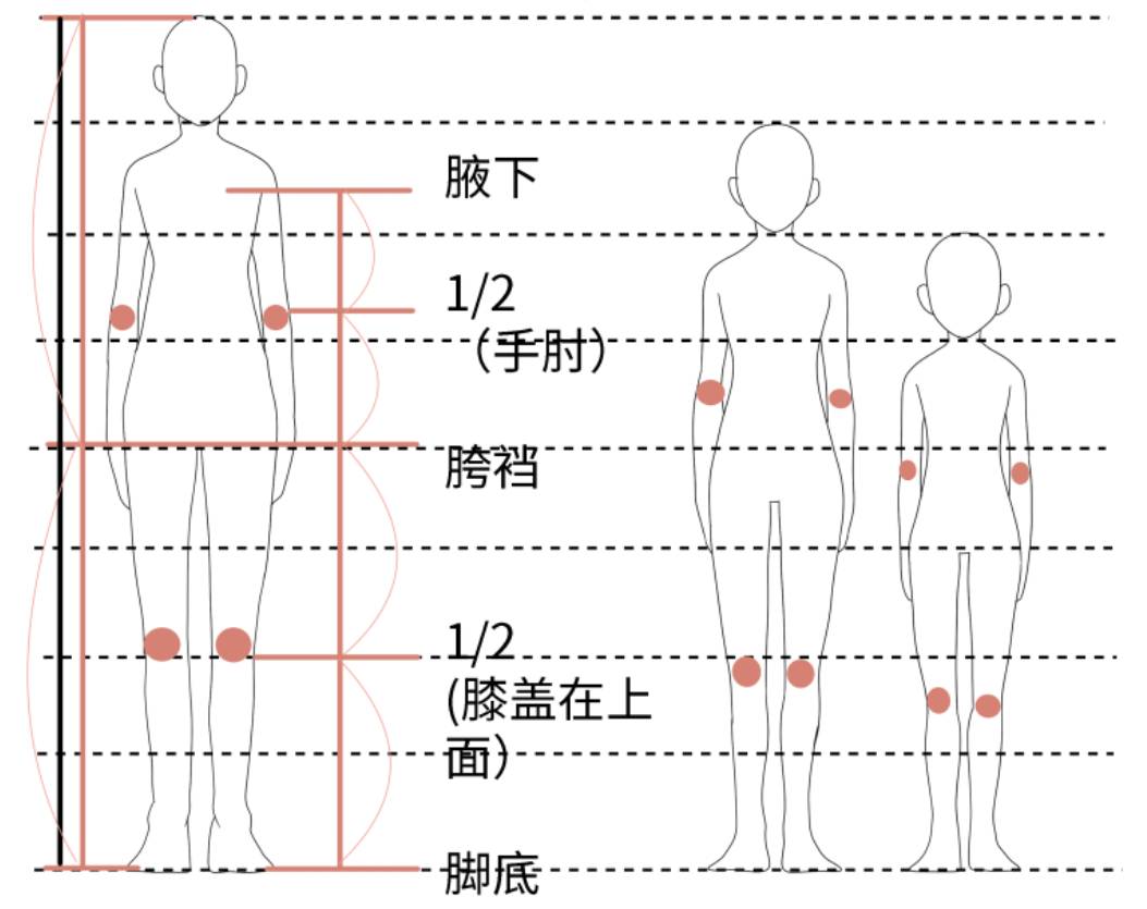 2、5头身以下的人体,其胯裆不在身长的1/2处。5头身和4头身的人体,其胯裆在身长的1/2处上面一点的位置。3头身的人体,其头、身体和脚的比例为1:1:1.2头身的人体,其胯裆位于头部以下的身体1/2处下面一点的位置。