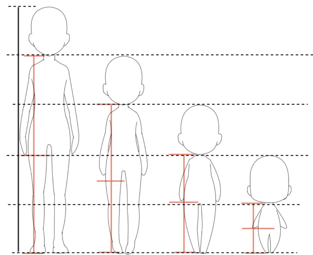 1、头身比越低,人物轮廓越圆,腰部和关节等也逐渐被省略。
